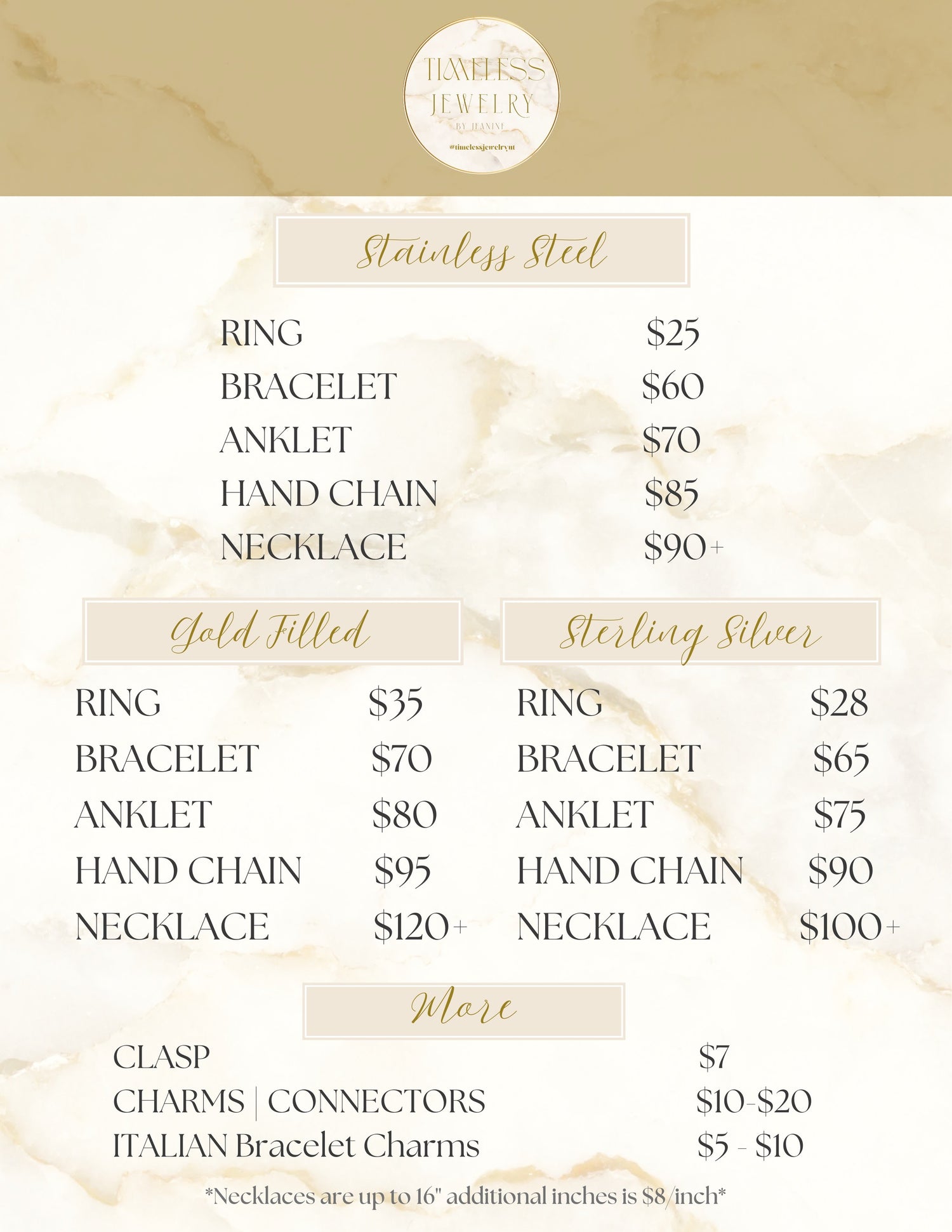Explore our Timeless Jewelry by Jeanine price list — featuring elegant options in stainless steel, gold filled, and sterling silver.