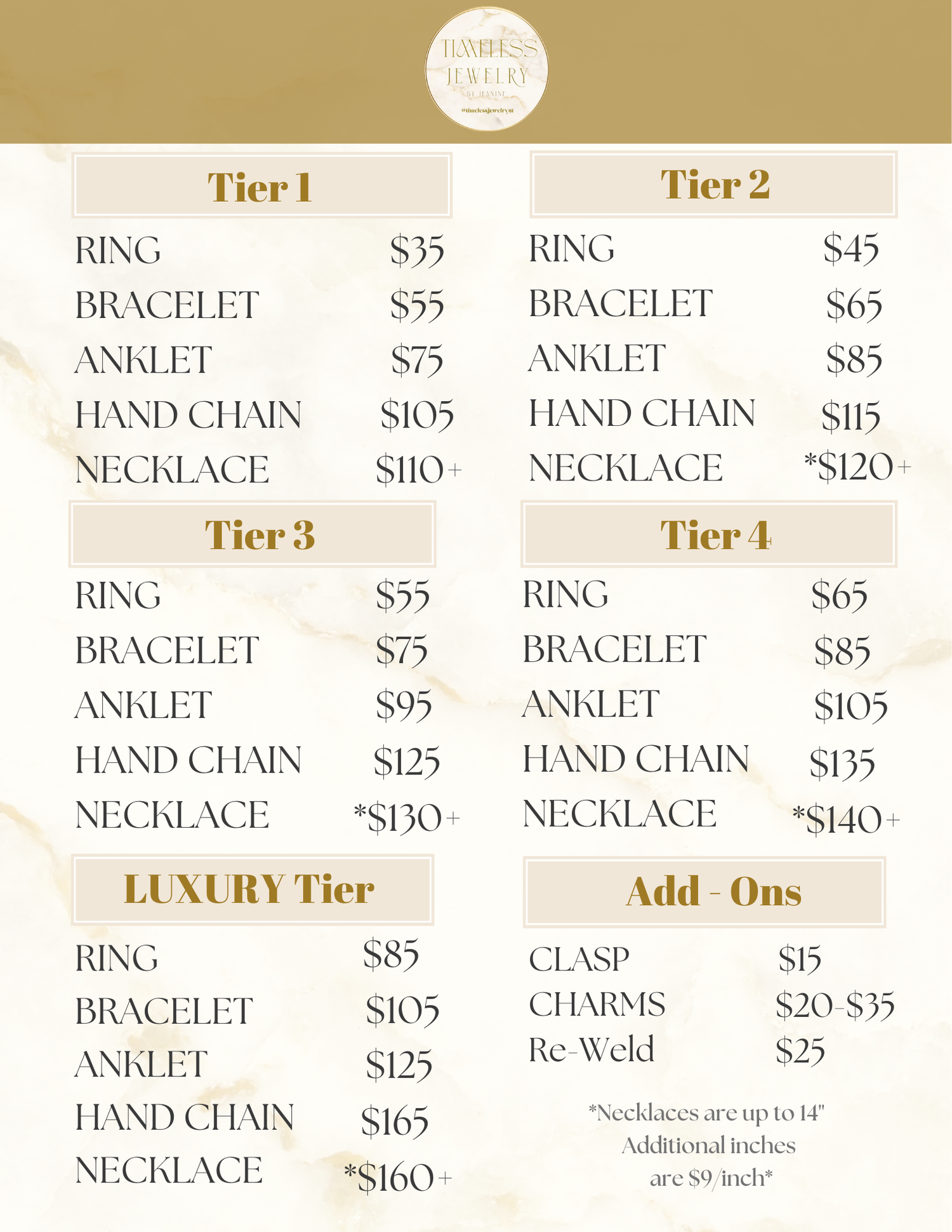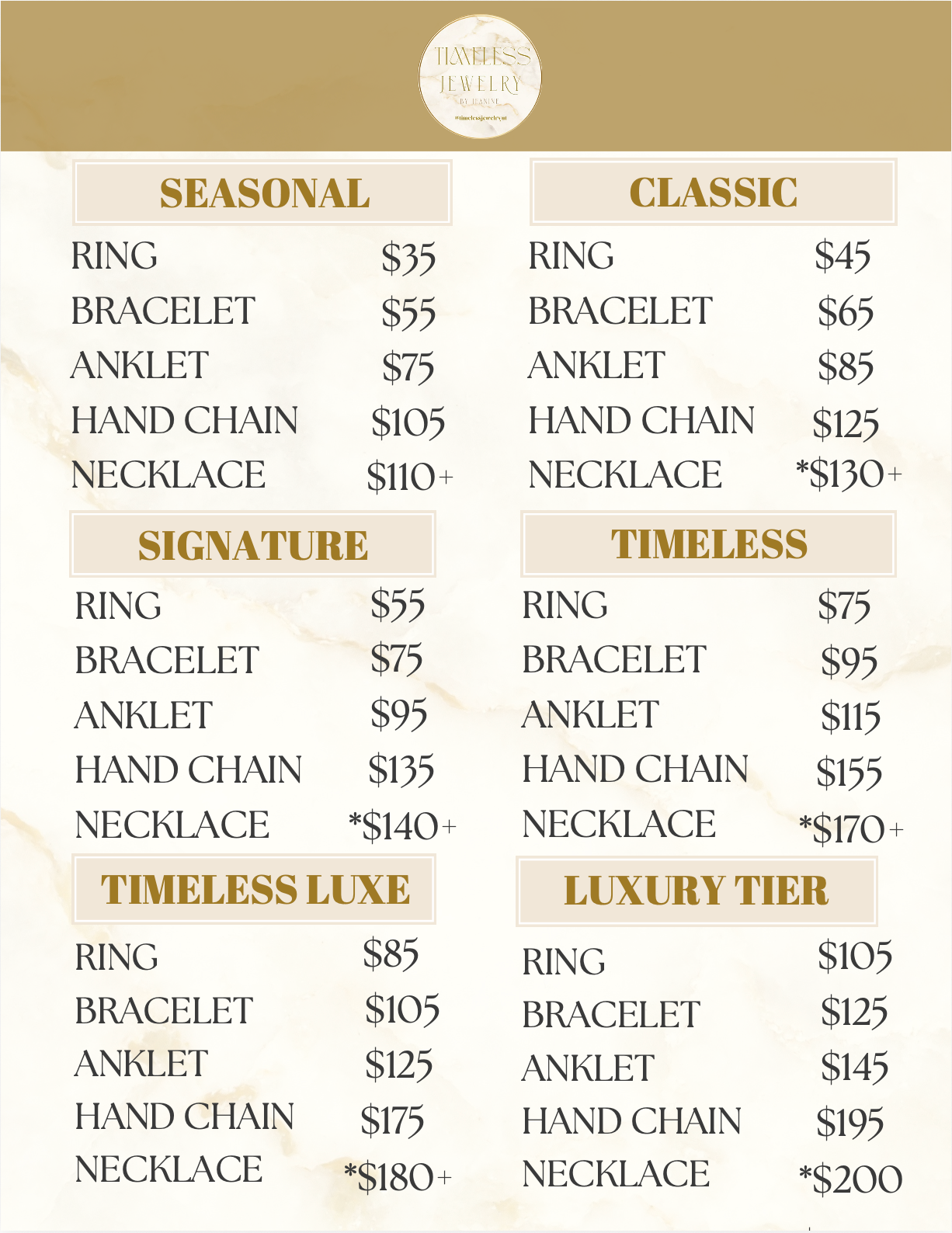 Explore our Timeless Jewelry by Jeanine price list — featuring elegant options in 14k gold filled, sterling silver and PVD Stainless Steel.